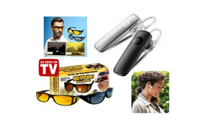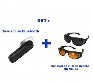 Oferta contine:1 x Casca Bluetooth 1 x Set 2 perechi ochelari zi si noapte Casca bluetooth cu atasament dupa ureche detasabil, silicon de protectie interior ureche, cablu incarcator usb tip microusb.Compatibil cu orice telefon. Specificatii:- versiune Bluetooth 4.1 mod:hfp1.6,hsp1.2,a2dp1.2,avrcp1.4- timp convorbire 6 ore- standby pana la 120 ore- timp de încarcare de 2 ore- raza de actiune: maxim 10m- calitate clara a sunetului- reducerea zgomotului de fundal- design atractiv- model subtire si usoara - culori disponibile: alb sau negru (in functie de stoc)Casca Bluetooth - este perfecta pentru smartphone-uri ! Dispune de functia DeepSleep™ care ne ajuta sa reducem consumul bateriei. Cele doua microfoane reduc zgomotul si vantul, astfel incat apelurile sa fie clare, ridicandu-se la cele mai inalte standarde de calitate! Puteti asculta muzica, radio pe Internet si altele. Set 2 perechi ochelari de condus de zi si de noapte Ochelarii sunt prevazuti cu protectie UV, acesti ochelari model HD reprezinta un mare avantaj pentru cei cu ochii sensibili.Tehnologia HD va ofera o claritate pe care nu ati mai experimentat-o pana acum. Ochelarii pot fi folisiti ca ochelari de soare pentru ca lentilele sale colorate ofera protectie UVA si UVB pentru ochii dumneavoastra. Ochelarii ofera protectie maxima datorita lentilelor sale High Definition.Prevazuti cu protectie contra razelor UV, acestia reprezinta un mare avantaj pentru cei cu ochii sensibili. Au definitie mare, camp vizual largit, protectie pentru vedere laterala, oferind o culoare calda si relaxanta. Pachetul contine: 1 x ochelari zi; 1 x ochelari noapte