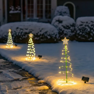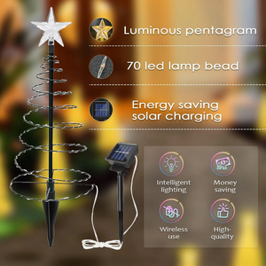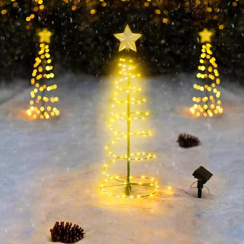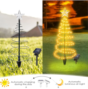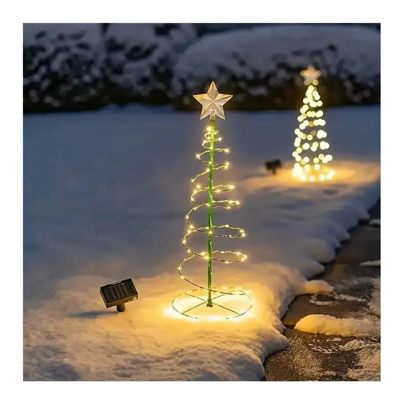 Decoratiunea solara reprezintă un brad de Crăciun stilizat, cu o stea strălucitoare în partea de sus. Acest design evocă atmosfera magică a sărbătorilor de iarnă.