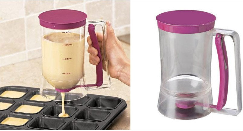 Bucurati-va de clatite, briose si torturi fara mizerie. Atunci cand este utilizat ca distribuitor de aluat pentru pancake, permite o amplasare precisa direct pe tava, tigaie sau oriunde este nevoie de aluat. Manerul cu arc deschide si inchide duza dozatorului pentru a ajuta la reglarea marimii tuturor produselor dvs. coapte;Copiii iubesc sa o foloseasca ca si distribuitor de aluat pentru cuptor datorita designului sau distractiv si usor;Acest instrument de coacere fara mizerie este prevazut cu un capac de inchidere si este fabricat din plastic durabil;Petreceti mai mult timp savurand bunurile dvs. de cofetarie si mai putin timp facand curat cu dispenserul pentru aluat Batter;Dispozitivul are capacitate de pana la 4 cani sau 900 ml de aluat.