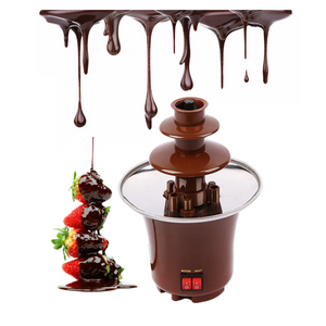 Fantana de ciocolata va permite savurarea deliciosului desert alaturi de fructe sanatoase si gustoase.Copiii vor fi incantati de desertul rezultat din aceasta fantana, fructe, bezele, biscuit, piscoturi sau napolitate, toate imbracate in delicioasa ciocolata. Instructiuni de utilizare:- se aseaza fantana pe o masa stabila;- se porneste fantana de ciocolata pentru a se incalzi platoul unde urmeaza sa se puna ciocolata si se lasa aproximativ 5 minute, ianinte sa se adauge ciocolata;- pentru un rezultat impresionant se foloseste doar ciocolata speciala pentru fantani de ciocolata;- ciocolata trebuie sa fie topita complet inainte sa se adauge in baza fantanii;- daca ciocolata este slaba in grasimi, adaugati unt sau ulei, pentru a obtine o textura fluida;- dupa ce se incalzeste platoul se pune ciocolatata pana la limita maxima a acestuia;- se porneste motorul fantanii de ciocolata care va impinge ciocolata prin tubul cu spirala in partea superioara a fantanii de unde va curge ca o fantana;- lasati sa se scurga timp de 2 minute, dupa care inchideti motorul pentru 30 minute, pentru a elimina eventualele bule de aer;- daca ciocolata nu se scurge corespunzator, adaugati putin ulei.- puteti achizitiona ciocolata din magazine si supermarketuri si o puteti prepara in functie de compozitia acesteia; Caracteristici tehnice:Putere: 65 W;Se alimenteaza la 230V;Dimensiuni : 14,5 x 22 cm.;Realizata din otel inoxidabil satinat si plastic rezistent la caldura;2 Nivele de scurgere a ciocolateicapacitate de pana la 300g ciocolataUsor de utilizat si curatat.