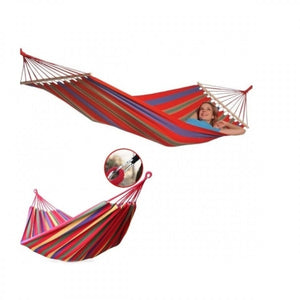 Hamac cu intinzator din lemn, confectionat din bumbac este extrem de rezistent, usor si ocupa putin spatiu, de aceea nu ar trebui sa lipseasca din recuzita dvs. de camping.Cele doua margini ale suprafetei de sezut ofera o legatura deosebit de stransa. Datorita acestei suprafete robuste, stabilitatea exceptionala este garantata.Confortul este sporit datorita unei multitudini de sfori de suspensie care distribuie greutatea in mod egal intre panza si hamac si prin urmare da un sentiment unic de gravitatie.In scopul de a realiza un hamac de calitate este important ca franghiile de suspensie si suprafata de sezut sa fie rezistente la o greutate cat mai mare.Gretate maxima permisibila 120kg.Material: - bumbac si bare de lemnDimensiune: - 200 x 80 cmCuloare: multicolor.Pachetul contine un singur hamac.