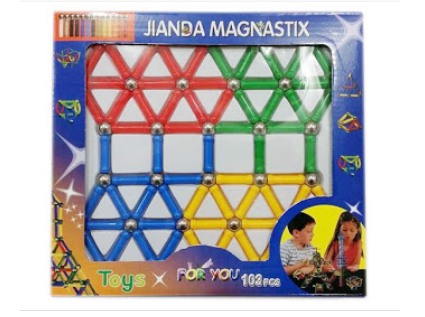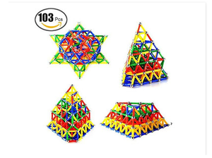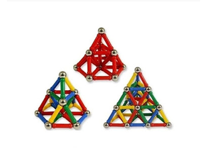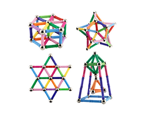 Setul contine 103 piese ce formeaza un sistem ingenios de constructii simple alcatuit din 71 betisoare magnetice in 4 variante cromatice ( albastre, verzi,galbene, rosii ) si 32 bilute cromate din otel, din care pot fi construite o multitudine de figuri geometrice bidimensionale si tridimensionale.