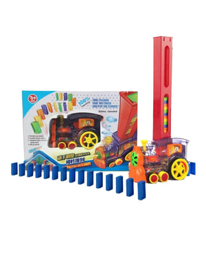 Trenuletul electric emite sunete si lumini, are un design placut si elibereaza piesele domino unul cate unul.