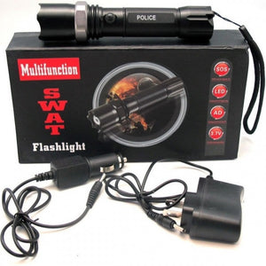 Lanterna multifunctionala Swat are 3 functii, una din ele fiind functia de SOS. Apasand butonul on / off prin atingere usoara veti activa flashuri de avertizare, in cazul in care v-ati ratacit, ati fost atacat, etc.Lanterna Tactical Swat poate fi reincarcata atat la priza 220V cat si la priza auto. Specificatii tehnice lanterna Swat:· design ergonomic;· greutate 125g;· usor de utilizat;· bec 3W;· baterie 4800mAh, 3.7V li-ion;· indicator LED;· 18000 lumeni; Pachetul lanterna Swat contine:· incarcator pentru priza;· incarcator bricheta pentru masina;· lanterna Swat;· snur pentru prindere;· baterie reincarcabila;· cutie depozitare si transport.