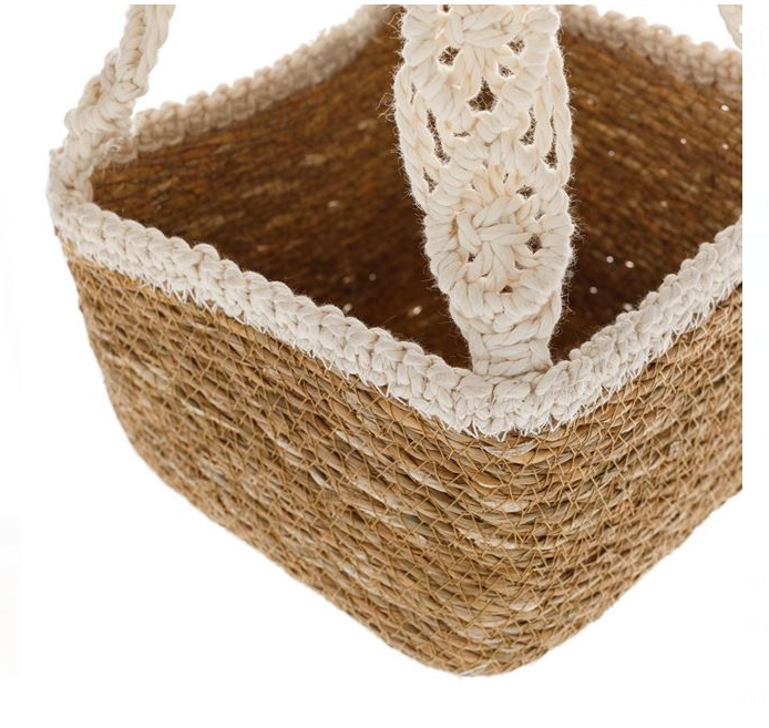 Masca ghiveci flori, impletita, patrata, cu interior din plastic, finisaj macrame si sfori (52cm)