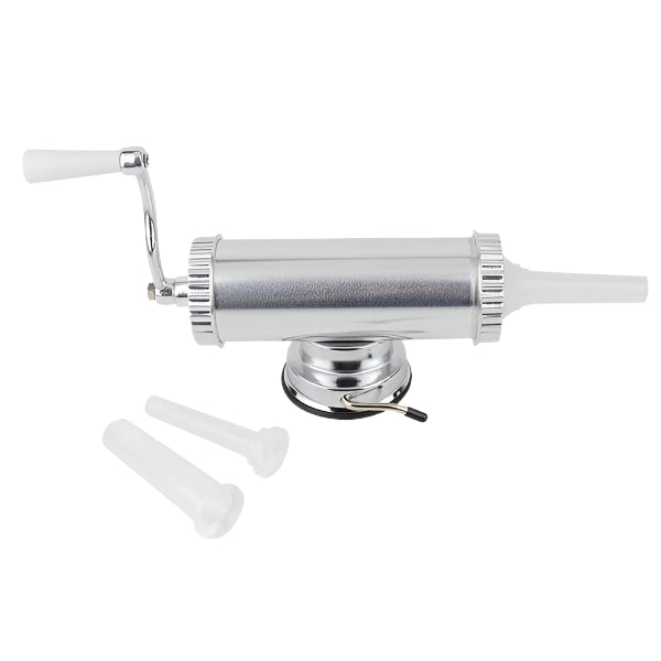 Masina de facut carnati este creata din aluminiu dur inoxidabil si dispune de trei palnii cu care poti realiza carnati de diferite dimensiuni: 15 mm, 19 mm si 22 mm.