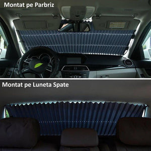 Descriere : Stiati ca temperatura din interiorul unei masini care sta la soare poate ajunge pana la 55 de grade C? Protejeaza-ti bordul si volanul masinii de razele UV si de caldura verii cu acest parasolar auto retractabil tip jaluzea. Acesta este recomandat mai ales familiilor cu copii mici sau animale de companie, deoarece acestia nu trebuie sa intre intr-o masina infierbantata. Scapa de caldura excesiva a masinii dupa o zi lunga de vara. Acest parasolar impiedica incalzirea excesiva a interiorului masinii tale. Nu va mai fi necesara ventilarea indelungata sau setarea aerului conditionat pe o treapta ridicata. Parasolarul poate fi montat cu usurinta pe interiorul parbrizului sau pe luneta spate cu ajutorul ventuzelor.Datorita designului sau compact si subtire, nu creeaza un spatiu mort suplimentar pe parbriz, nefiind necesara indepartarea lui dupa fiecare utilizare. In plus, ventuzele puternice permit mentinerea parasolarului pe parbriz si in timpul calatoriei. Nu va mai fi necesar sa il depozitati separat in portbagaj ca in cazul unui parasolar clasic. Inaltimea parasolarului poate fi ajustata prin decupare cu foarfeca, cu 5-10 cm in cazul in care inaltimea parbrizului este mai mica decat marimea sa originala. Este conceput pentru a fi montat intr-o mare varietate mare de vehicule: autoutilitare, camioane, berline, SUV-uri, etc. Acest produs este, de asemenea, parasolarul auto cu cea mai rapida aplicare de pe piata. Pur si simplu trageti parasolarul anti-UV din partea dreapta spre stanga si fixati-l pe pozitie.