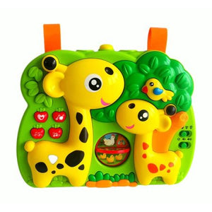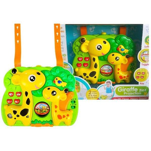 Proiector in forma de girafa si cu sunete muzicale. Poate fi atasat de patut iar copilul il poate folosi stand in fundulet sau intins pe spate. Proiectie dubla cu claritate HD pentru ca cel mic sa vada clar imaginile.