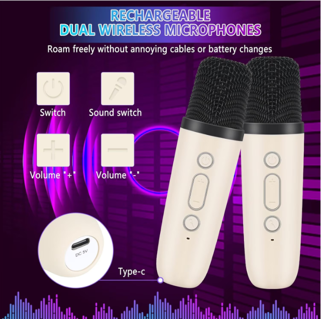 【Mini Karaoke Wireless Portabil】: Luati petrecerea cu dumneavoastra oriunde mergeti cu aceasta masina mini karaoke portabila. Echipata cu un microfon wireless, acest difuzor Bluetooth este perfect pentru ca parintii si copiii sa se bucure împreuna de distractia karaoke acasa sau în deplasare.