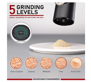 Nivelul de macinare poate fi reglat, astfel puteti alege intre o rasnire fina sau grosiera. Alegeti o rasnire mai fina a sarii si a piperului pentru a adauga o aroma subtila preparatelor tale sau o rasnire grosiera pentru a adauga ultimele retusuri salatei dumneavoastra.