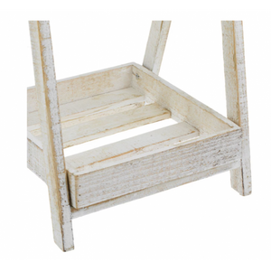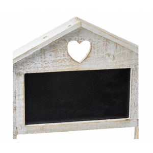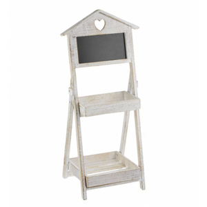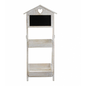 Suport decorativ din lemn vintage cu doua nivele pentru flori, de culoare alba, cu inima perforata. Rafturile au dimensiunile 25x25cm si 24x16cm. In partea de sus are o tabla neagra pentru a va scrie notitele.