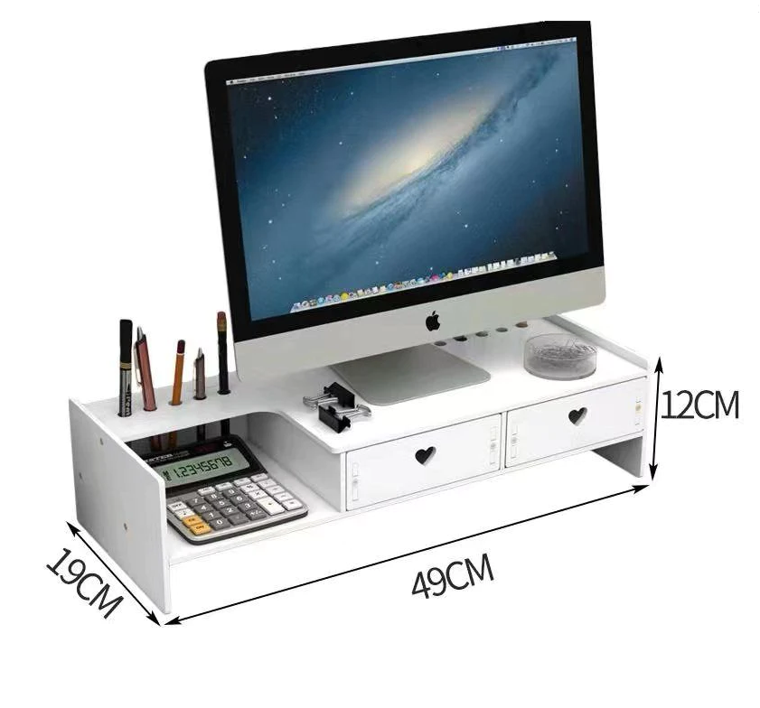 【Aplicatie】: Acest suport pentru ecranul computerului poate fi folosit ca organizator de birou. Îti extinde spatiul de lucru. Stocare multifunctionala, fara murdarie sau dezordine. Are spatiu de stocare pentru monitor, tastatura, mouse, pixuri, cești și alte mici consumabile de birou. Poate fi folosit în orice loc, cum ar fi biroul, camera de studiu, dormitorul, etc.