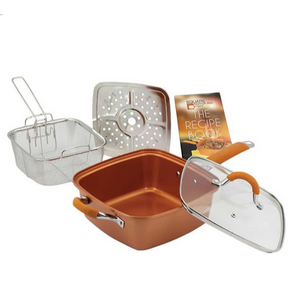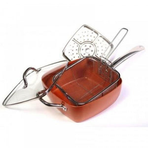 Aceasta tigaie patrata are la interior un strat de cupru si o puteti folosi ca tigaie, cratita, friteuza, tava, vas pentru fiert paste, si lista poate continua!Peretii inalti impiedica mancarea sa stropeasca pe aragaz/soba. Aceasta este perfecta pentru chiftele, pui prajit, cotlet de porc sau costita, si multe altele. Deoarece este non aderenta, nu trebuie frecata.Datorita formei patrate, suprafata de gatit este mult mai mare, in acest fel puteti gati mult mai multe alimente: 4 felii de paine, 8 pulpe mai mari de pui, 10 felii de cotlet, sau chiar 20 de carnati sau mici, in acest fel puteti servi preparatele mult mai repede. Se poate folosi si in cuptor pana la o temperatura de 260°C. Coaceti rulade delicioase, care aluneca usor cand le scoateti din tigaie, sau o musaca gustoasa din paste si cascaval, placinte cu pui, paine de casa, sau o portie mare de lasagna.Gratie cuprului pur si a tehnologiei rezistente la zgarieturi, face fata celui mai dur test. Inelul de aluminiu de pe fund, asigura distribuirea uniforma a caldurii. Se poate folosi pe toate tipurile de aragaz: cu gaz, placa ceramica, electric, cu inductie.Daca introduceti cosul, aveti deja friteuza gata! Acum puteti praji peste, chipsuri, snacks-uri din pui, cartofi, si multe altele. Inmuiati legumele in aluat, le prajiti si vor fi delicioase chiar si pentru copiii carora nu le plac zarzavaturile!